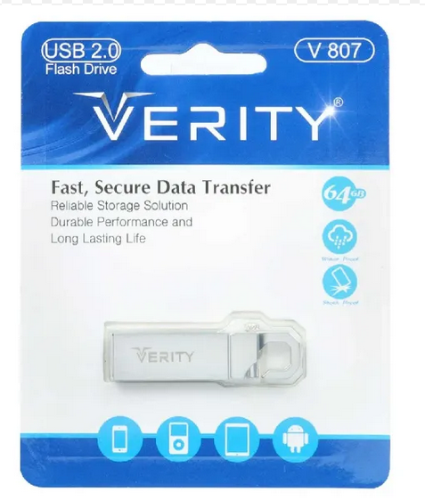 فلش مموری «V807» یکی دیگر از محصولات «وریتی» است که طراحی آن به شکلی تقریبا فانتزی بوده و جنس آن از فلز است. فلش مموری V807 وریتی ظرفیتی معادل 64 گیگابایت داشته و با سیستم عاملهای ویندوز و مکینتاش سازگاری دارد. از آنجاییکه کانکتور آن از نوع USB 2.0 است، سرعت انتقال اطلاعات استاندارد در مدل V807 به 480 مگابیت بر ثانیه میرسد. این مقدار معادل 60 مگابایت بر ثانیه است. بهتر است بدانید این فلش مموری در برابر قطرات آب و ضربه هم مقاومت دارد. در طراحی این فلش مموری محلی در نظرگرفته شده است که به شما امکان میدهد آن را به بندهای مختلف یا دسته کلید وصل کنید.